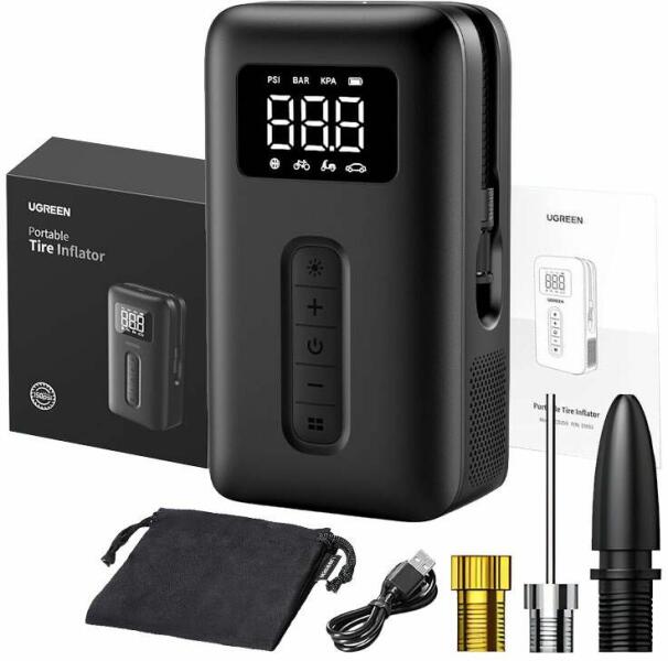 Abroncsfelfújó UGREEN 15951 Az Ugreen 15951 autószivattyú nélkülözhetetlen eszköz minden vezető számára, gyors és hatékony autó-, motor- és kerékpárabroncs-felfújást biztosít.  Fejlett jellemzőinek és könnyű kezelhetőségének köszönhetően ideális mind vészhelyzetekben, mind az optimális gumiabroncsnyomás rendszeres karbantartásához.  Sőt, remekül felfújja a golyókat, amit a készletben található cserélhető hegyekkel könnyít meg. Gyors működés és automatikus kikapcsolás A fejlett technológia lehetővé teszi a levegő felfújását 15 l/perc sebességgel, és eléri a 150 PSI maximális nyomást.  A készülék körülbelül 2 perc alatt képes felfújni egy normál autógumit 2,0 bar-ról 2,5 bar-ra.  Az automatikus kikapcsolás funkció a beállított nyomás elérésekor megakadályozza a gumiabroncs túltöltését, és minden helyzetben biztonságot nyújt. Vezeték nélküli és könnyen hordozható Az Ugreen 15951 pumpa vezeték nélküli és kompakt kialakítású, így bárhol könnyen hordozható és használható.  Könnyű, ergonomikus és ideális kirándulásokhoz, utazásokhoz vagy kerékpáros kirándulásokhoz. Digitális LCD kijelző és LED lámpa A továbbfejlesztett chippel és nagy LCD kijelzővel felszerelt szivattyú három egységben (BAR, KPA, PSI) pontos nyomásleolvasást tesz lehetővé.  A beépített LED-es lámpa ideálissá teszi út menti vészhelyzetek és éjszakai használatra, biztonságot és a szükséges láthatóságot biztosítva. Nagy akkumulátorkapacitás és tartós kialakítás A beépített 2500 mAh-s akkumulátor akár 4 lapos autógumit is képes felfújni.  A kétoldalas hőleadó kialakítás hatékonyan meghosszabbítja a szivattyú élettartamát, lehetővé téve a folyamatos működést túlmelegedés nélkül. Különféle tartozékok és töltési módok A szivattyú négy töltési módot és egyéni értékek beállításának lehetőségét kínálja.  A készlet kiterjedt tartozékai lehetővé teszik különféle gumiabroncsok és eszközök, például autó-, motor- és kerékpárabroncsok, valamint labdák, légmatracok és mentőgyűrűk felfújását. A doboz tartalma: